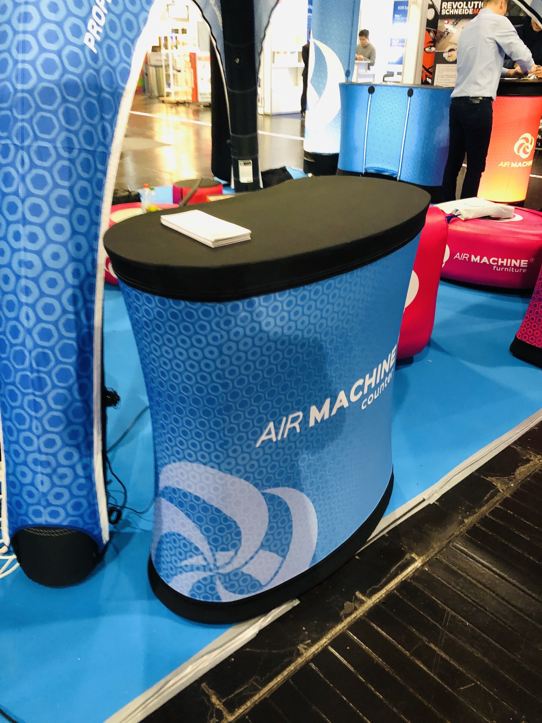 AirMachine Tresen und Counter sind pneumatische Präsentationsmöbel für den professionellen Einsatz auf Messen, Events, Roadshows und Promotions. Sie eignen sich ideal als Empfangstresen, Informationspunkt, Verkostungsstation oder POS-Lösung und verbinden hohe Markenwirkung mit praktischer Funktionalität.