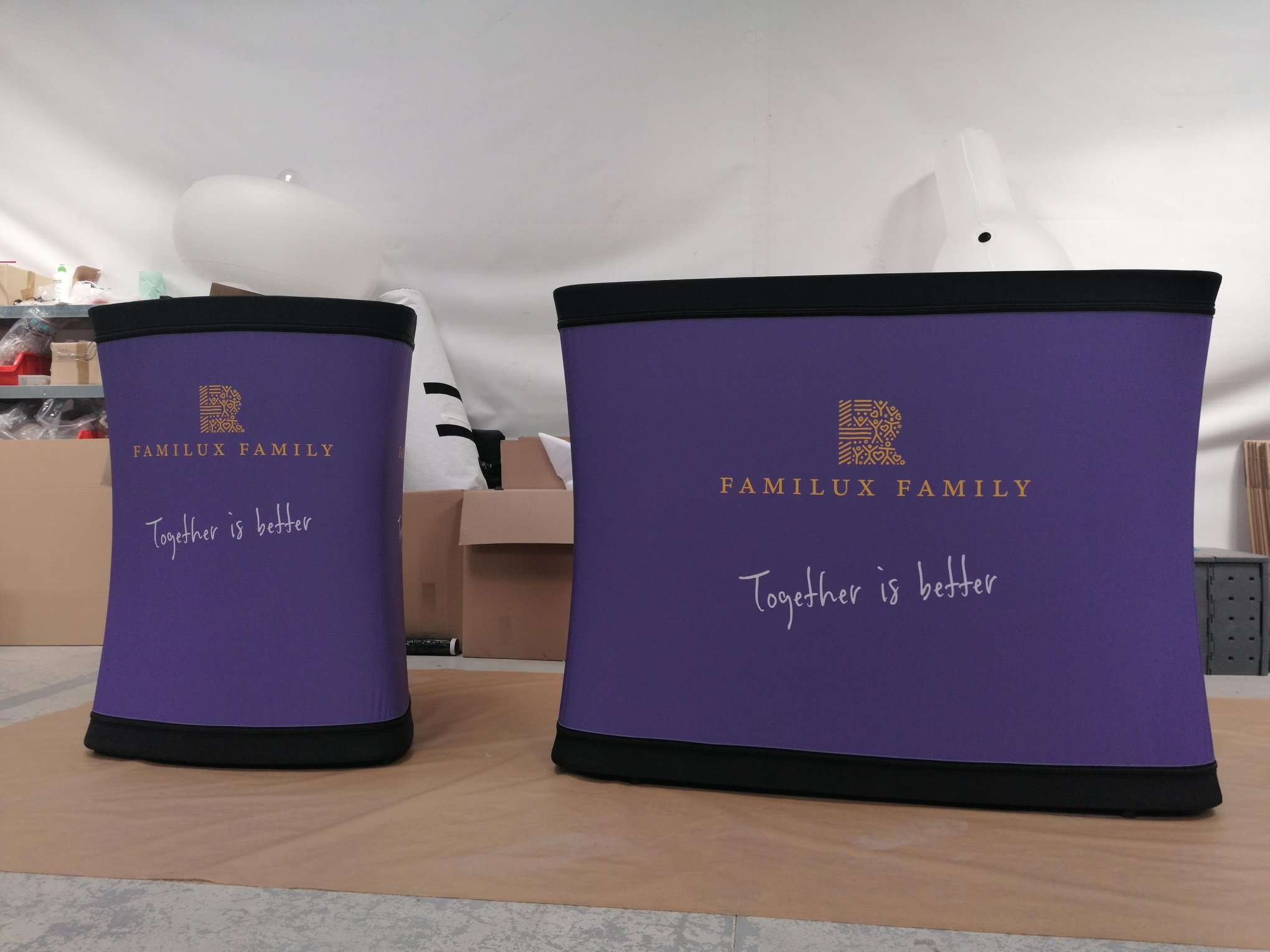 Im Inneren sorgt eine luftdicht verschweißte TPU-Bladder für Stabilität, während die robuste Polyester-Außenhülleden visuellen Auftritt bestimmt. Durch unterschiedliche Formen, Höhen und Breiten lassen sich die Counter flexibel an verschiedenste Einsatzszenarien anpassen – vom kompakten Promotioneinsatz bis zur großzügigen Präsentationsfläche.